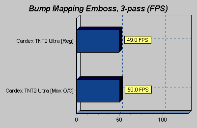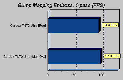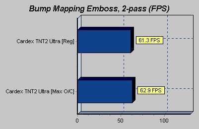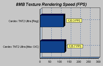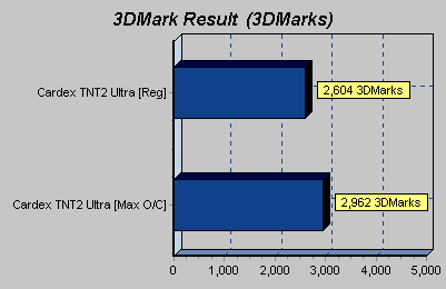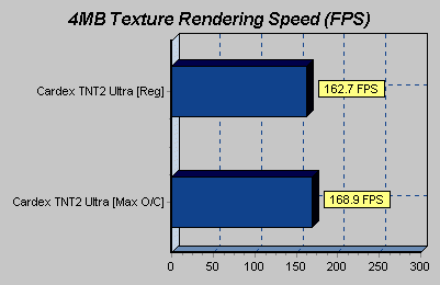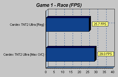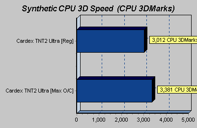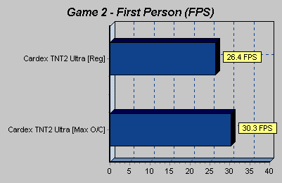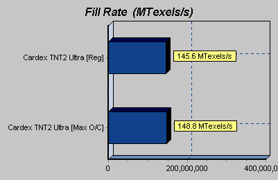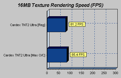 I had expected the Cardex TNT2 Ultra to be just a good overclocker as its predecessor (Cardex TNT). Unfortunately the equipped heatsink and fan combo couldn't dissipate the heat sufficiently as I believe the Cardex TNT2 Ultra is definitely heating up to temperatures in excess of 50 degrees! Even though I added an additional 0.22A fan at the back of the PCB to blow the rear of the TNT2 UItra chip, it wasn't sufficient!Whilst I've seen other TNT2 Ultra based cards hit past 200MHz for core or memory speed, this TNT2 Ultra could only hit a maximum speed of 175MHz for core and 188MHz for memory, a pretty puny increase.