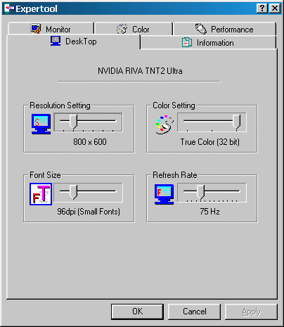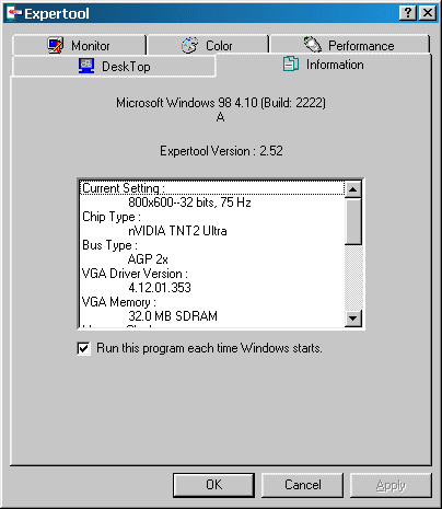 After rebooting, you would probably notice the new Expertool logo sitting on your task bar, this provides full control over the Cardex TNT2 whether it's overclocking the core speed or the memory speed or simply adjusting the refresh rate, anyway here's the lowdown!