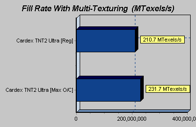 Video 2D (MPixels/s) Direct3D (MPixels/s) OpenGL (MPixels/s) TNT2 Ultra (150/183) 41.56004 128.3647 94.22583 TNT2 UItra (166/185) 43.24878 130.2609 98.57465 TNT2 Ultra (175/192) 43.07176 137.5641 100.9281 Note: Tests conducted at 800x600 (32bit Colour)