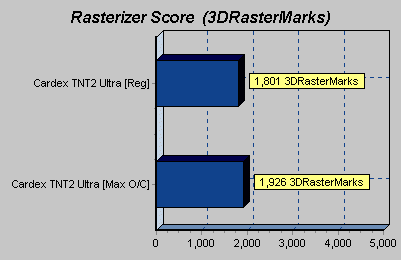 With such competitive pricing, the Cardex TNT2 Ultra is one of the tastiest TNT2 Ultra prepositions available in the market, but be sure to pair it up with at least a 400MHz (P2 or K6-2) system, otherwise you're just simply not unleashing the brute power of the TNT2 chip! If you're just interested in the TNT2 Ultra chip (without overclocking) this is one excellent card, retailing at $225 it sure gives other offerings from more distinguished manufacturers a good run for their money! Out of a 5 stars, I feel it fully deserves the 4 star award!