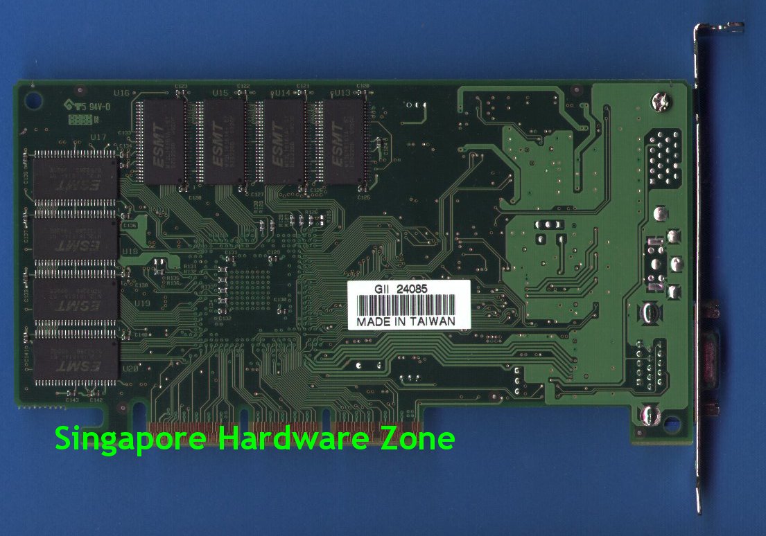 Here's a close-up view of the ESMT RAM used on board the Cardex TNT2 Ultra, identical to the ones used on board the Creative GEForce 256. Personally, I've not heard of ESMT RAM and I cannot clarify its 5ns rating as stated on this chip.