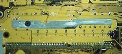 If you take a closer look at the motherboard, especially at the area above the slot, you'll see that the huge silver heatsink has been removed in this newer revision. If you've read reviews of this board from other websites, you'll see pictures of a large component heatsink placed on top of the power transistors. Even boards like MS-6167 and P7-F200A have smaller heatsinks attached to each of the transistors. In revisions 1.04 and later, Asus has done away with this and has resorted to dissipating the heat through the motherboard instead. If you look on the underside of the motherboard, you'll see a huge blob of solder below these transistors, which is used like a heatsink. Here's what I mean :-