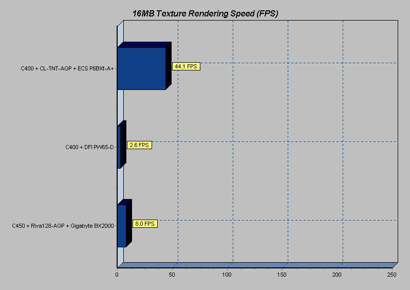 The integrated i752 wasn't so great after all but let's reserve comments when video-cards based on i752 with very fast local memory crop up. As of now, you can expect performance very similar to the Riva-128. The odd thing is that the i752 still losses out to the Riva-128 by 1-fps even after its enhancements from i740 at 640x480 and 800x600 resolution. But the Direct-AGP connection shows some use at 1024x768 resolution where the Riva-128 struggles to even load the game. Let's dwell into some in-depth 3D-Mark99-MAX results: