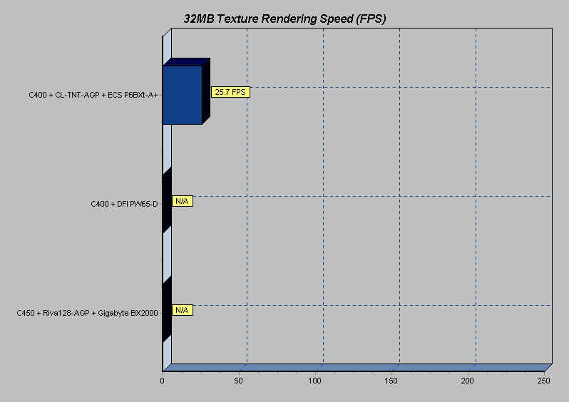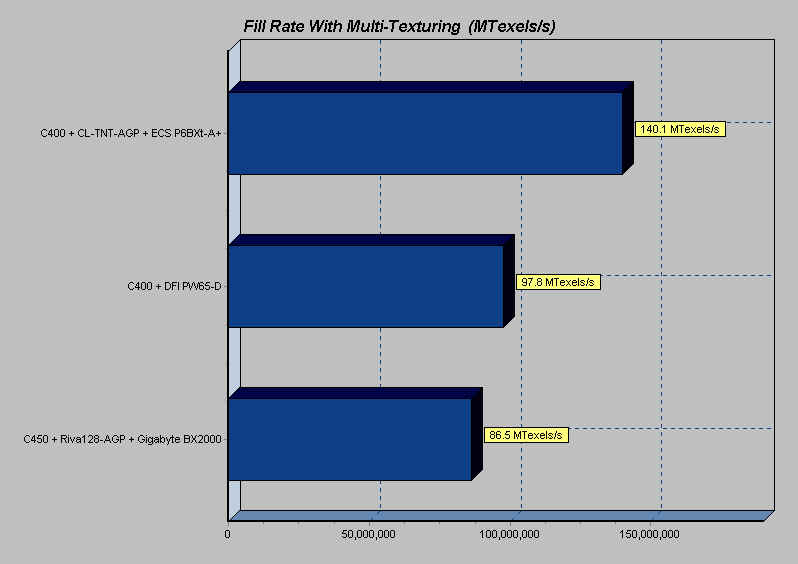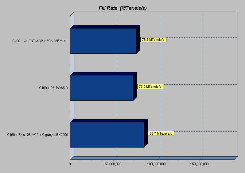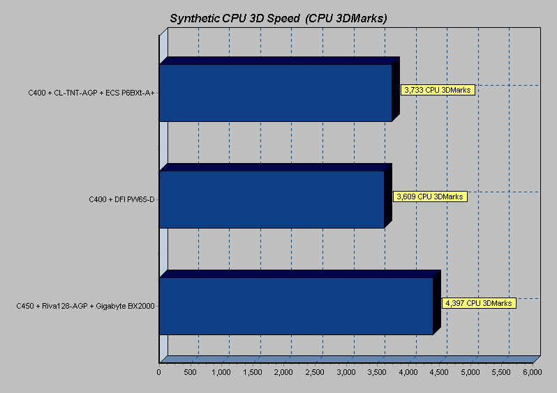 The processor used for this test is a C-300A slot-1 which is of the SL32A batch overclockable to 450 and a C-400 PPGA which is of the SL37X with an Asus Slocket. Since I acquired the C-300A much latter, I can't show many results for it. The C-400 PPGA I had was not overclockable at all even with another MSI Slocket. I will investigate that latter. The column in concern is processor with DFI PW65-D, the Gigabyte BX2000 is a BX-chipset based board for comparison. The Riva-128 video-card was chosen because it is as close as possible to the descendant of the i752 graphics engine that I could test on, the i740 based video cards.