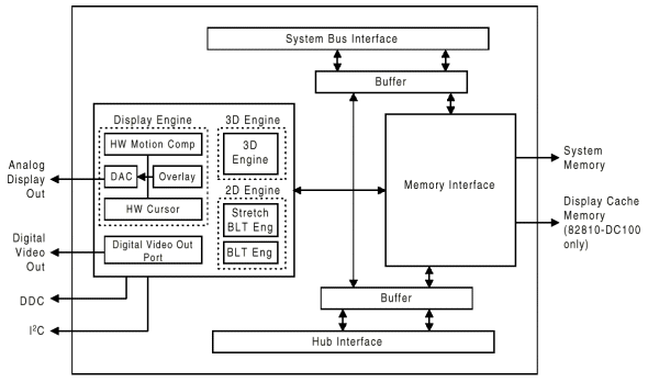 There are 2 versions of the GMCH, the 82810 GMCH and the 82810-DC100 GMCH, the main difference being that the DC100 version has the Display Cache Interface integrated which supports 4mb of external display cache. Both versions of the GMCH are pin-compatible, hence one manufacturer can have a low cost model and the premium model without the need to re-design the base model. Here's a schematic of the GMCH: