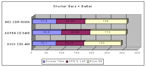 The above is an illustration of the access time, CPU utilisation in % and the price of the various CD-ROMS. The results reflected that the ASUS CDS-400 happens to be slightly more efficient in time, resources and dollar/performance.