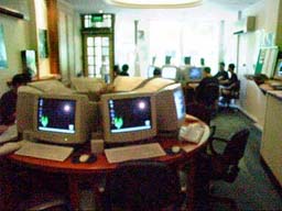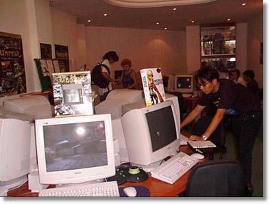 The layout of the shop can be seen rather clearly from this picture (left). The cafe provides a lot of services; Basic Internet Access and Network games like World Cup 98 , Unreal, Quake II, Starcraft, etc. You will definitely find the latest network games there. You won't be wasting your money as you will be using a complete multimedia system during your play or simply just surfing. All systems are Pentium II 266 Mhz, equipped with Canopus PURE3D Voodoo Cards, Canopus Total3D Video cards and Altec Lansing ACS 45 and big 19' Philips Monitor to enhance your computing experience.