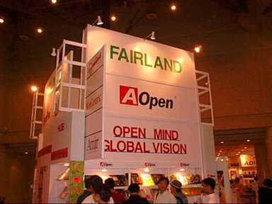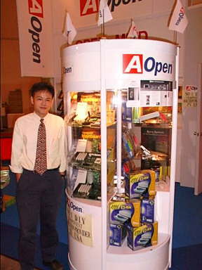 AOpen Singapore Distributor, Fairland are here to display their famous products. | Jerry standing beside the AOpen container which contains the AOpen Mainboard and 40X CDROM. | |