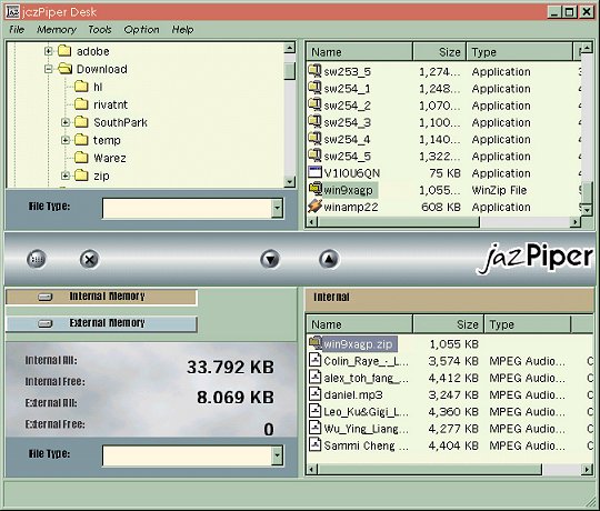Another cool thing about the software is that it allows the jazPiper to be used as a portable storage device. By zipping up your files, you can upload as many zipped files as you like into the jazPiper so long as you don't exceed the 32MB of storage space. After transporting the files to somewhere else, you can then download them into the PC using the software and data cable. Hmmm, then again, who say we can't distribute MP3 files? :)