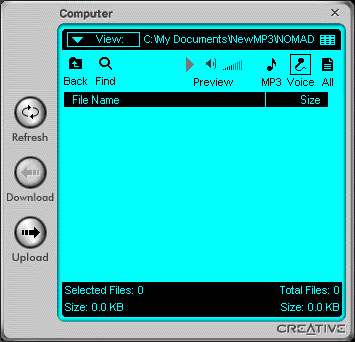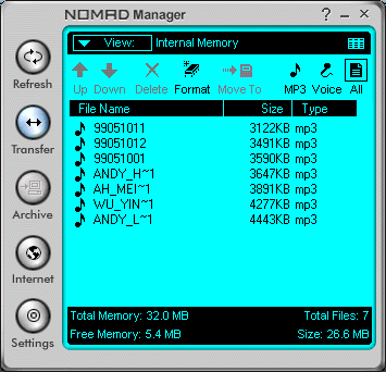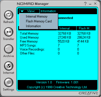 Like the other MP3 player updating software, the Creative NOMAD Manager is written for use in Windows 95/98. When you start the NOMAD Manager, a graphically designed NOMAD player will appear while your computer loads the program. The interface of the NOMAD Manager reminds me of the touch-screen PDA. As I have said, the NOMAD player is divided into two storage sections – 32MB of internal memory and the Flash memory card consisting of another 32MB. To view the different sections, just simply click on the “View” button located at the top left-hand side of the program, and then click on the section you want to go to.