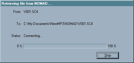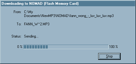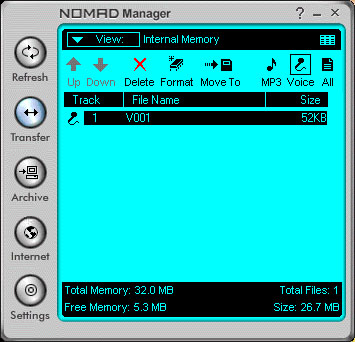 To download MP3 files into the NOMAD player, just click on the “Transfer” button located at the left side of the program and an identical window will open which will allow you to download the MP3 files from a specific directory on your computer. It took me less than 10 minutes to complete a full transfer of 64MB of MP3 files.