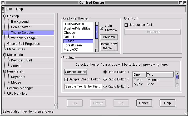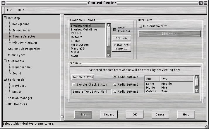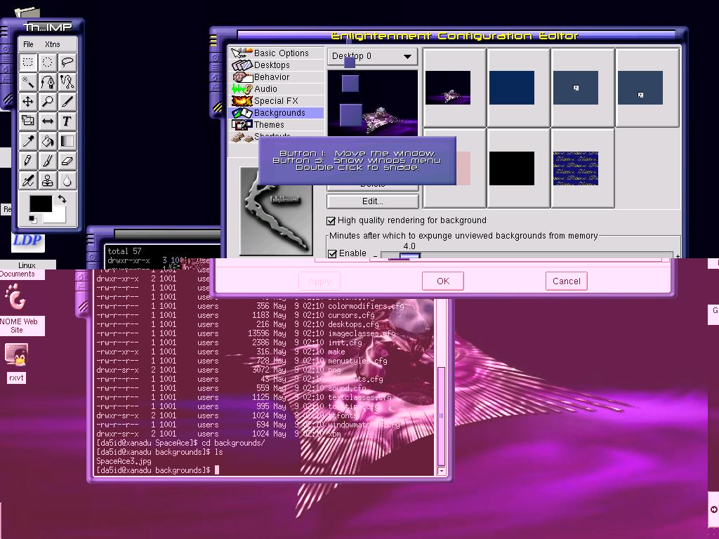 With the new Red Hat 6.0, we are given the choice of a couple of desktop managers (GNOME or KDE) as well as a couple of window managers (enlightenment, afterstep, fvwm). Hmm, firstly what are desktop managers? From a Win9x point of view, it's the program that controls the look of your desktop, including all the icons on the desktop + start button + widgets (such as scrollbars, editboxes). Whereas windows managers control how new windows come onto screen, the parts of a window which is not controlled by the program such as title bar, resize sections. So why does Linux make it so complicated? Well, it's all in the name of choice, with Win9x you only get one look, yeah you can customize the colors and the background but that's just that. With enlightenment and GNOME you can make all kinds of unbelievable themes for your desktop.