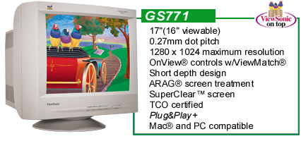 ConclusionAs far as 17" monitors go, the GS771 is "above average" enough to warrant a higher price than many peers. It is not a high-end monitor, but certainly is quite a performer in its own niche. So for most typical PC users, this monitor is a good investment. Personally, I would definitely cough out more money on a monitor. Afterall, it is the window into your computer and is not something you have to upgrade often.