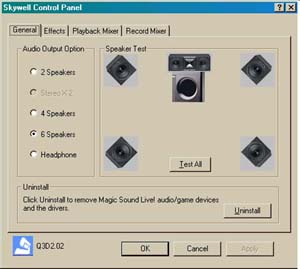 After the drivers were loaded, the sound control panel automatically loads into the task bar. Users can choose to turn this off and manually enter of the Magic Live Control Panel. The Magic Live Sound Control is quite similar to that of the Quad-Xtreme. Im not too surprised since both are using Media Forte chipsets and implement Qsound to handle the work. However the Magic Live does provide a few more features that make it a more robust product. Unlike the Quad-Xtreme, the Magic Live was easy to un-install. I had a difficult time trying to remove the Qsound effect from the Quad-Xtreme but the Magic Live was smooth as a babys skin with just click a on the Uninstall button, shut down Windows, physically remove the PCI Sound Card and thats all.