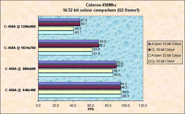Done @ 640 x 480 with OpenGL for Quake II V3.05, @ 800 x 600 for 3D Mark99 and @ 1024 x 768 for the Wintune98 tests. Colour depth = 16bit for all tests |