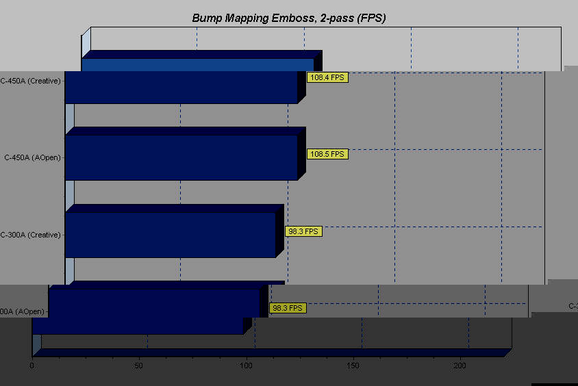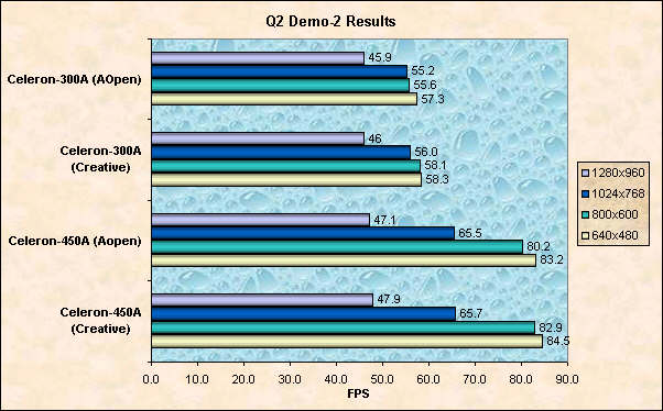 As you can see, the variance between the Creative and AOpen TNT2-Ultra differ only by about 1 FPS in which, Creative is leading in every test (all are using refrence drivers). Expect every other TNT2-Ultra to perform similar to these results unless your using manufacturer's drivers, but that too won't show any prominent difference.