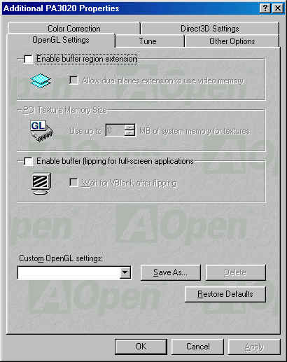 Overclocking I try to overclock the graphics card PA3020-G but have difficulty doing that. However I was able to overclock the rams to 190 Mhz and the chip to only a mere 155Mz, i.e. only 5 Mhz more which is not very impressive. However from the web site of Aopen the following document is found and according to it, the chip was found to be able to clock to 233/170. But I think this is depending your luck when you purphase the card. But I think the success rate for overclocking may not be very high.