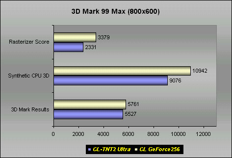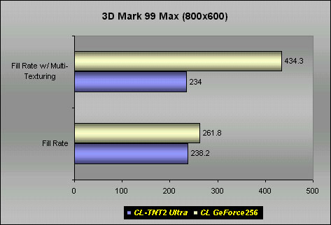 (MTexels/s) 640x480 800x600 1024x768In the 3D Mark tests, we can see that the GeForce really excels in its fill rate performance. Although it is quite an unfair comparison between the TNT2 Ultra (running on the weak Pentium III-600) and the GeForce (running on the K7-650), there is really no way that the TNT2 Ultra could beat the GeForce in the fill rate performance. Of course, I would love to show the power of the GeForce by pairing the GeForce with the weaker Pentium III-600, but due to timing constraints, I was unable to do so. However, the thought of setting up an ultimate gaming machine is enough motivation for me to stay up late to work on this review. :)