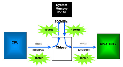 Let us consider the current Intel 440BX chipset with AGP 2x. Assume triangles at a rate of 2 million per second and that each triangle is an average of 90 bytes, thus, you would expect data transfers up to 180MB/s. This is well below the maximum bandwidth of the memory.
