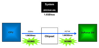 The GeForce 256 is also the first to implement AGP 4x with Fast Writes. The Fast Writes is part of the AGP 2.0 specification. It basically improves all writes from the CPU to the graphics chip. With this feature, systems with Fast Writes can have a dramatic increase in performance over systems without it.