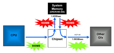However, with the increasing complexity of games, we can expect future games to have up to 10 million triangles per second. This would increase the required bandwidth up to 900MB/second. This exceeds the bandwidth that current systems can provide. With the introduction of the i820 Camino chipset with AGP 4x and Direct RDRAM support, transfer rates between the CPU and chipset would have increased to 1.06 GB/sec (133MHz FSB) and transfer rates between chipset and memory increased to 1.6 GB/sec (Direct RDRAM). However, the memory bandwidth is still not enough to support the required transfer at 900MB/sec (both ways), as illustrated below.