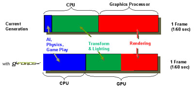 The GeForce 256 chipset is the world's first Graphics Processing Unit which packs some really incredible features together with a whole new design in its architecture. The QuadEngine design has separate engines for transformation, lighting, setup and rendering. With transformation and lighting built into the chipset, it literally frees up the CPU for other processes. According to nVidia, it is capable of handling up to 15 million triangles per second, almost twice as much as what the Voodoo3-3500 can do. Now, that's a pretty impressive number I must say. The figure below illustrates how the GPU will exactly benefit the gamer and the game developer.