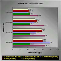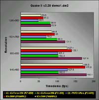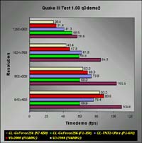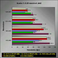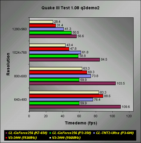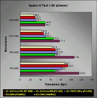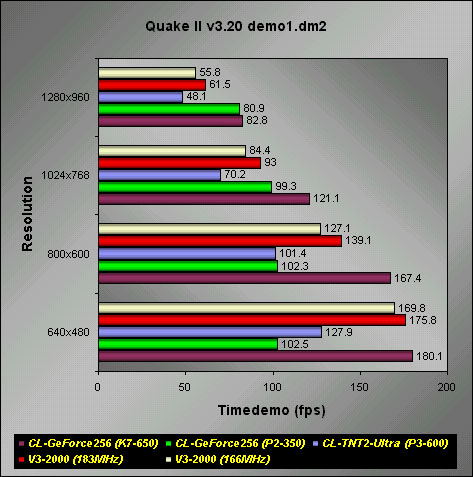 Quake II v3.20In the demo1, demo2 and massive1 timedemos, the GeForce topped the Voodoo3 running at 183MHz. Although it may not be a fair comparison to make with the TNT2 Ultra, but you should be able to see that the GeForce is indeed faster than the TNT2 Ultra. I doubt even the fastest TNT2 Ultra cards in a K7-650 setup could beat the GeForce. The Voodoo3 can closely match the GeForce at low resolutions like 640x480, but at higher resolutions, it fails miserably.