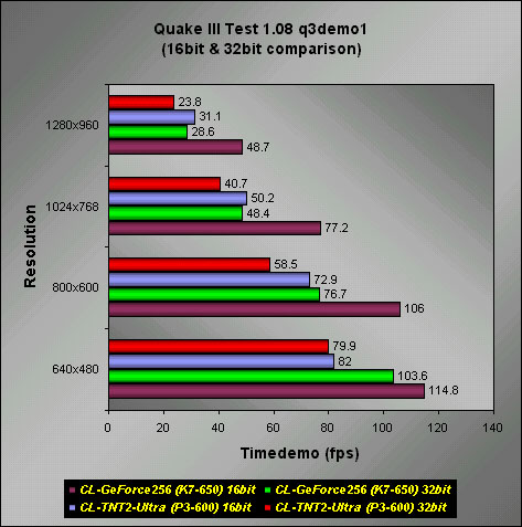Over here, we can see that the GeForce performs reasonable well at 32bit color depth at resolutions below 800x600. However, at higher resolutions, the GeForce comes pretty close to the TNT2-Ultra. Note that the TNT2-Ultra was tested on the "weak" Pentium III-600, and may have performed better on the K7-650.