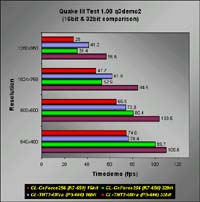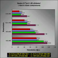 (16bit & 32bit comparison)In the 3D Mark tests, you can see that the Rasterizer and Fill Rate performances are halved if you choose to run at 32-bit color depth. However, the 3D Mark scores were pretty consistent at lower resolutions but at 1024x768, you begin to notice a slight decline in performance. Anyway, the performance is still pretty acceptable. Seems like 32-bit gaming would come to pass real soon.