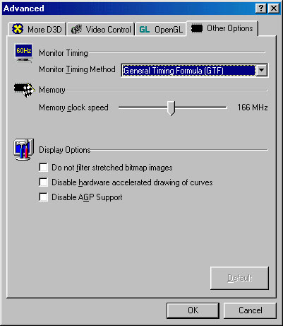 Upon rebooting, you will notice the Advanced BlasterControl Panel icon in the task bar. It provides almost similar tweaking and adjustment functions that you'll see in the TNT or TNT2. Anyway, here's the complete table of the display features for you to drool over.