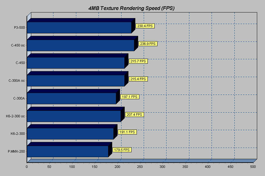 Below is a graph comparing the 32-bit colour performance drop compared to 16-bit colour using Quake-2. I've only included the results for the Celeron-450 and using Demo-1 because using any other CPUs and speed grade results in the exact same minor drop. Same goes for the Demo-2 results which reflects the same amount of drop as in Demo-1. If you insist on seeing the results, you can ask me but it's not worth the comparison as u can see (even for the K6-2).![]()