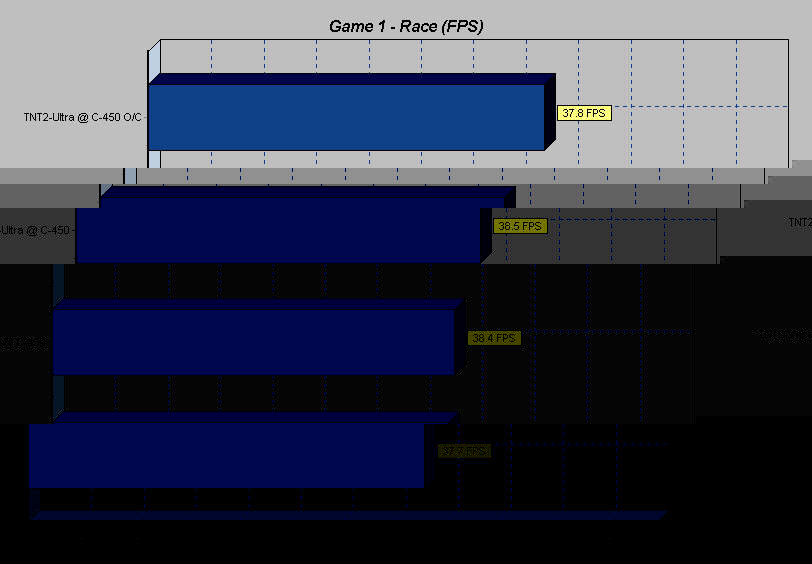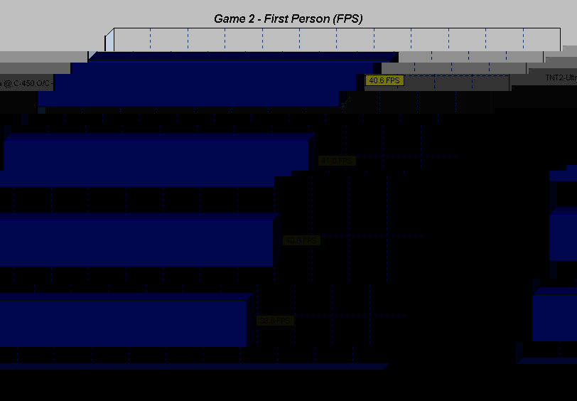 Wow! Even a K6-2-300 is playable at 1280x960 resolution! But the sad fact is if you do couple an Ultra-TNT2 with a typical K6-2, you're not utillising your Ultra to it's potential at all. For lower speed CPU's e.g. anything below an AMD K6-2-400 and Intel Celeron/P2-333, there is no point in getting an Ultra-TNT2 because the results will be very close to or similar to a normal TNT2 (I've done some informal testing and the difference is a maximum of just a few FPS) unless, you're going to upgrade soon and don't mind pumping in $50 to $100 more.