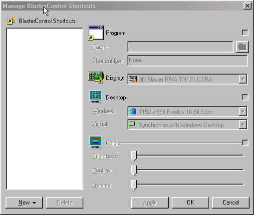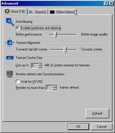 Upon the next reboot, everything has settled nicely and I was able to see my beautiful Star-Wars: Episode-1 wallpaper in all its glory! Between the TNT2's 300Mhz RAMDAC and the TNT's 250Mhz RAMDAC, there is almost no discernable difference up to 1024x768. Bumping the resolution to 1280x960, you can see it's a little sharper than the old TNT at this resolution. You want to know how 1600x1200 looks like? Beats me! I don't have a 21" monitor you know? Ok, on to the next section to show you what Creative drivers have to offer.