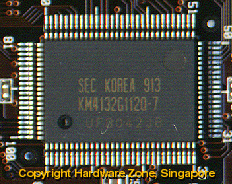 The card is huge in size. Much bigger than the other numerous TNT2 cards that I've reviewed. It gave me a shock when I ripped it out of the box. Packed with 8 pieces of SEC 7ns RAM, it didn't look like a great deal. However, its power lies uncovered. With an active cooling fan / heatsink combination, temperature during runtime is kept down to a warm level. TV-out is optional. A snapshot of the RAM is shown on the left.