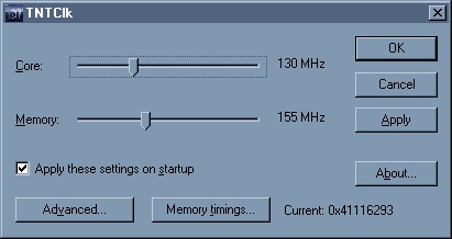 The latest NVIDIA reference driver does actually allows users to bump up their clock rates. Meaning you can simply go into the display properties and adjust the slider clock to clock up your graphics card. No more requiring of the 'TNTclk' utility or the 'Powerstrip'. Work similar to Diamond's Incontrol Tools but this new registry tweak. You can simply test the new settings and even allow to apply the settings right at the startup. Cool ?