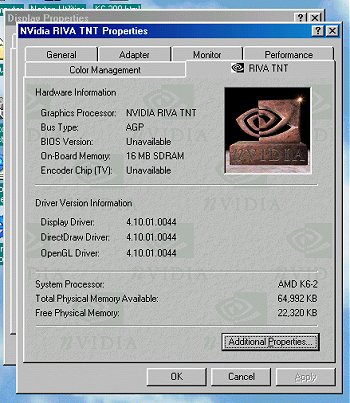 2D performance is way below par for a TNT but the Canopus Spectra running on the same system scored very much higher, therefore the drivers may not have been optimized in this area. 3D is on par with the Canopus Spectra TNT and can improve but this is due to the Super-7 motherboard and K6-2 chip used. Using a P2 system of the same speed, you'll see much higher performance. From the results, a super-7 system owner is better off buying a Banshee based card unless one is buying a video-card to keep for sometime to come, in which the more powerful TNT can be better utilised when the super-7 owner upgrades later on.For overclockers, you can push up the core speed up to 107Mhz and the ram up to 120Mhz using Power-Strip. It was fairly stable at this setting but performance gain isn't much. Beyond this speed for either the ram or core, your games will crash very quickly.