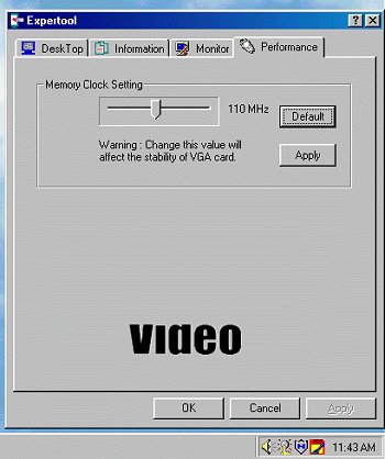 The Desktop tab has all the important items from the display properties. The refresh-rate slider can set refresh rates in very small steppings unlike those standard ones offered by windows. The same applies for the font-size slider. Most of the time your stuck with standard settings but the Expertool is more unique. The performance tab only has the memory clock slider to tamper with. If only it had the TNT core clock slider, probably none of us would use PowerStrip!! Here's how the Desktop and Performance tab look like(Don't worry of the cut off text, they are actually scrolling!):